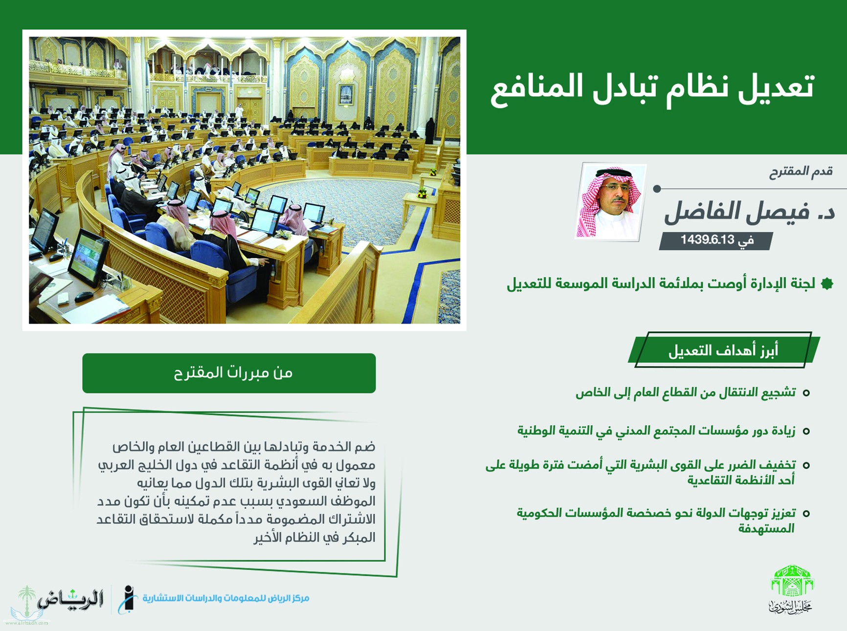 النظام وفقًا لآخر تعديل - مرسوم ملكي رقم (م /53) وتاريخ 23/7/1424 هـ بشأن الموافقة على نظام تبادل المنافع بين نظامي التقاعد المدني والعسكري، ونظام التأمينات الاجتماعية والجداول الاكتوارية والأحكام الملحقة بها